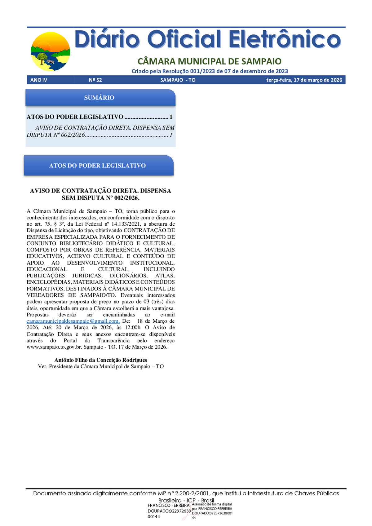 camaramunicipaldesampaio@gmail.com